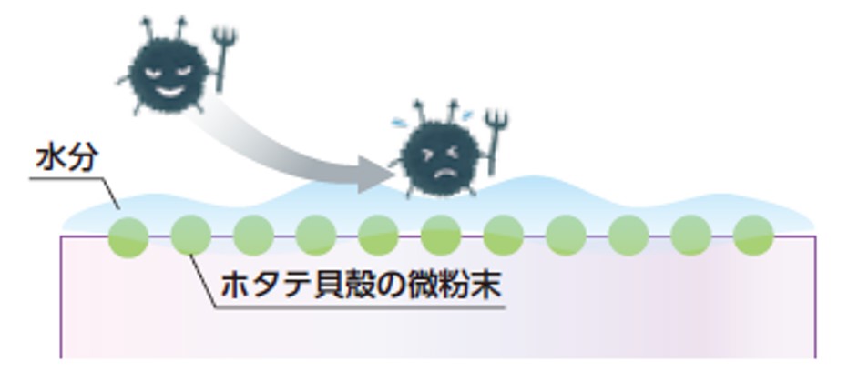 成果物の水分などでフィルム表面が濡れ、ホタテ貝殻の微粉末と接触することでアルカリ性となり、細菌を不活性化します。これが鮮度保持・抗菌効果につながります。