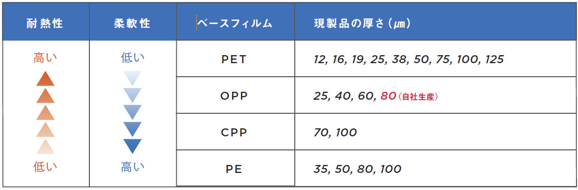 ※上表以外のベースフィルム、厚さでの加工も検討致します。
