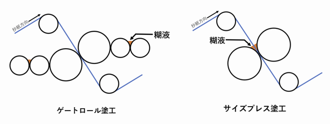 塗工液を満たしたロール間に紙を通し、圧力によって紙内部まで塗工液を浸透させる方式です。