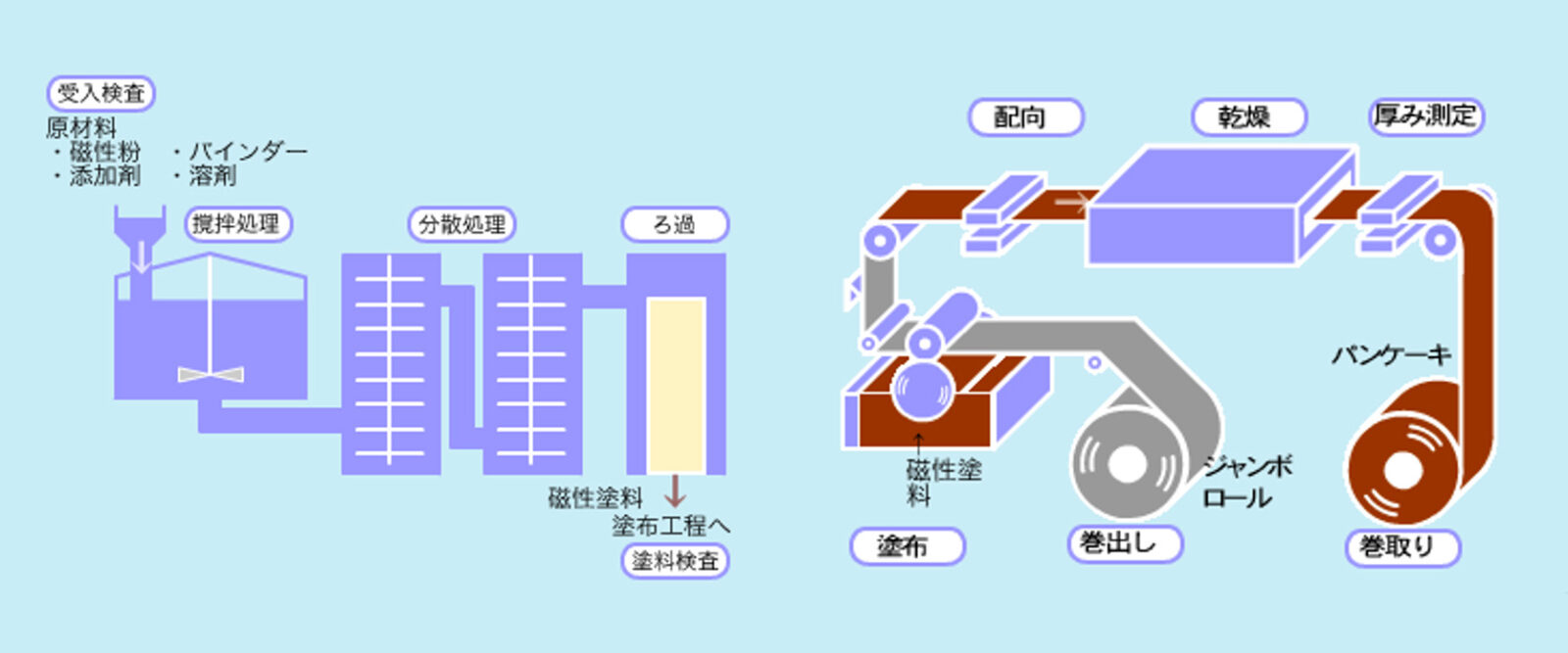 同じ磁性体を原料とするものにレコーディングテープなどがありますが、一般的には極性がなく磁性体を分散させやすい有機溶剤が溶媒として使用されますが、当社は環境にやさしい水を溶媒として、均一に磁性体を分散させた塗料を用います。